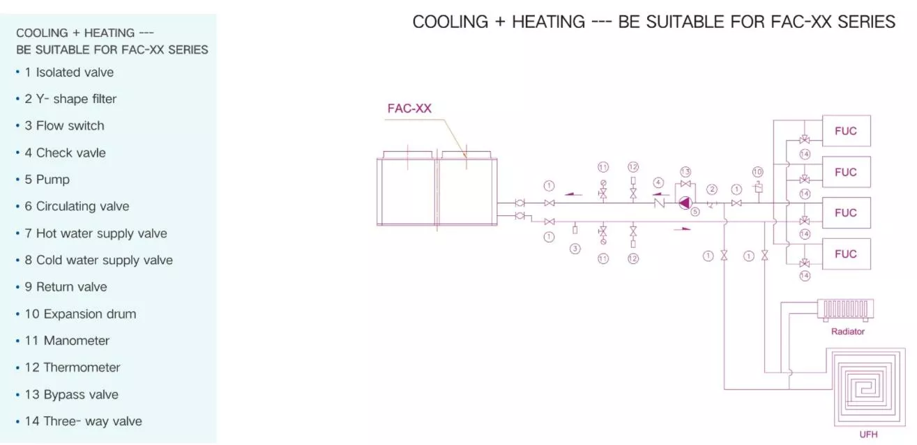 Nazivni radni uslovi hlađenja: temperatura povratnog vazduha na vazdušnoj strani 35℃, temperatura vode na ulazu na korišćenoj strani je 12℃, temperatura izlazne vode je 7℃