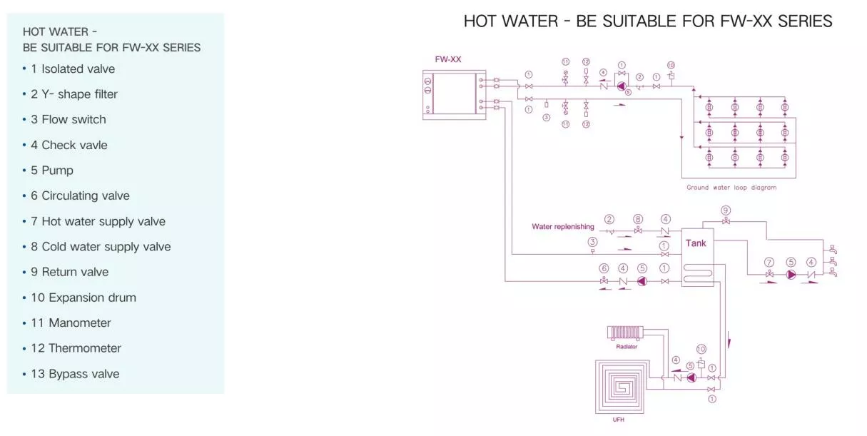 Nazivni radni uslovi grijanja: temperatura ulazne vode na strani izvora topline 15℃, izmjenjivač topline na strani tople vode početna temperatura 15℃, kraj temperature 60℃